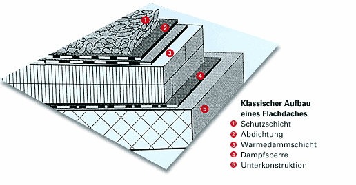 Der Aufbau solcher abgedichteten Dachflächen kann dabei je nach Zweck auf unterschiedliche Weise erfolgen. Allen gemeinsam ist jedoch die flächige, fugenlose und wasserdichte Abdichtung. Je nach Lage der Abdichtung und der Wärmedämmung werden grundsätzlich die belüftete und die nicht-belüftete Konstruktion unterschieden. Beim belüfteten Dach bleibt zwischen Abdichtungsträger und Wärmedämmung ein Luftraum zur Be- und Entlüftung. Beim nichtbelüfteten Dach liegt die Abdichtung direkt auf der Dämmschicht und diese direkt auf der Tragkonstruktion. Die verschiedenen Bauweisen haben zum Beispiel eine unterschiedliche Belastbarkeit zur Folge, was für eine spätere Nutzung ausschlaggebend sein kann.