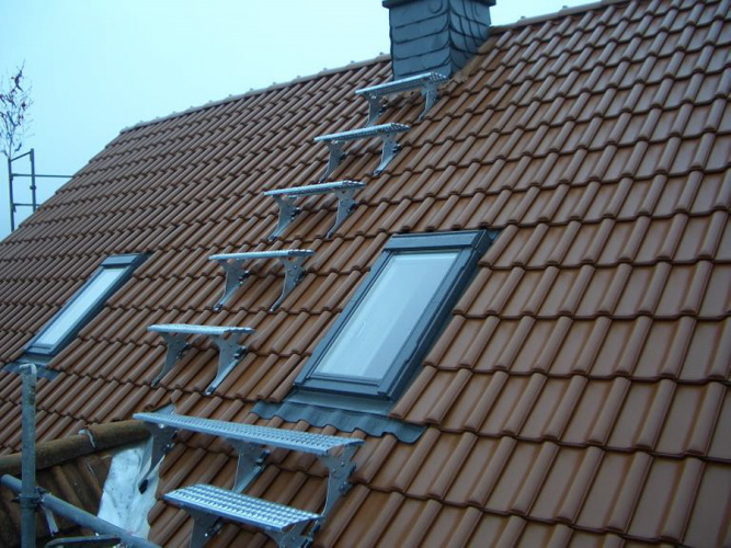 Sie sehen ein Ziegeldach mit zwei Velux Dachfenster, sowie einer Laufanlage für den Schornsteinfeger