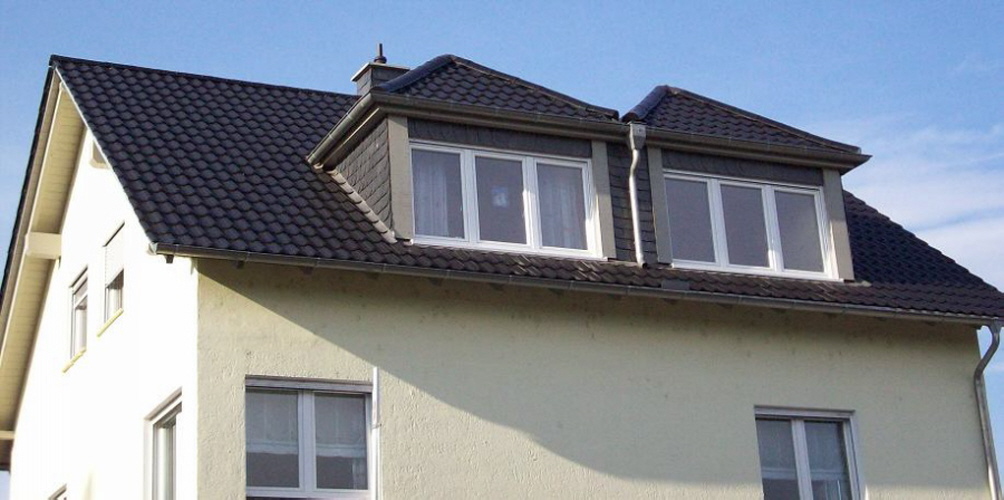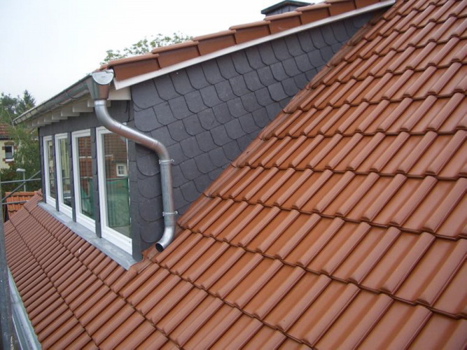 Eine Schleppgaube mit Schiefer bekleidet in einem Tonziegel Dach in Hattenheim