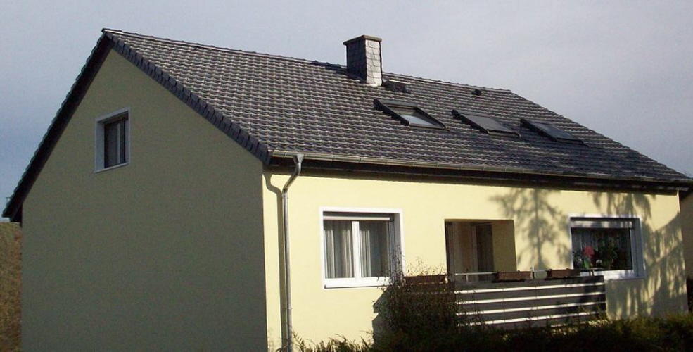 Ein zwei Familien Haus in Hattenheim gedeckt mit Tonziegel welche eine schwarzer Edelengobe haben